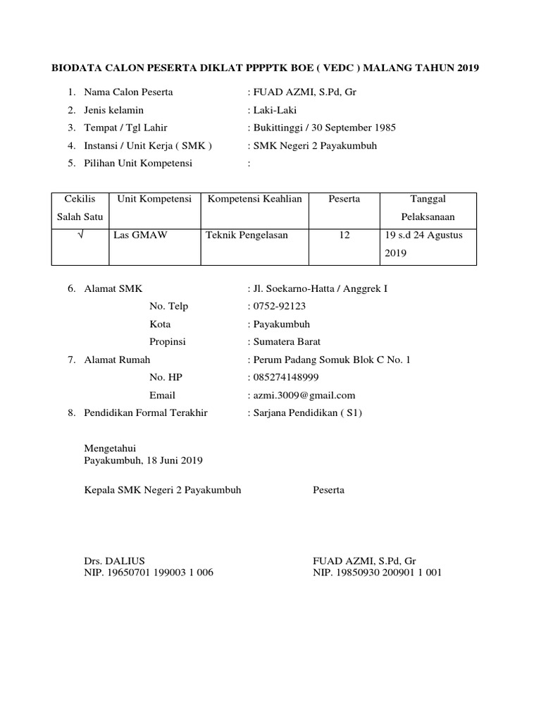 Biodata Calon Peserta Diklat Pppptk Boe Docx