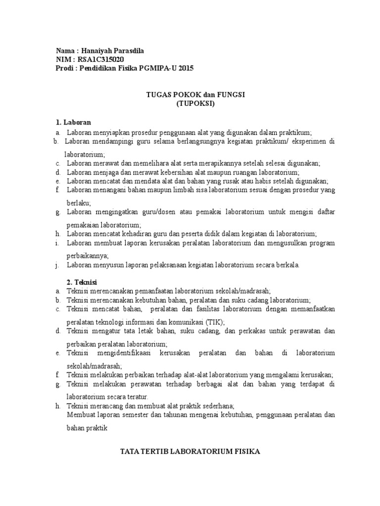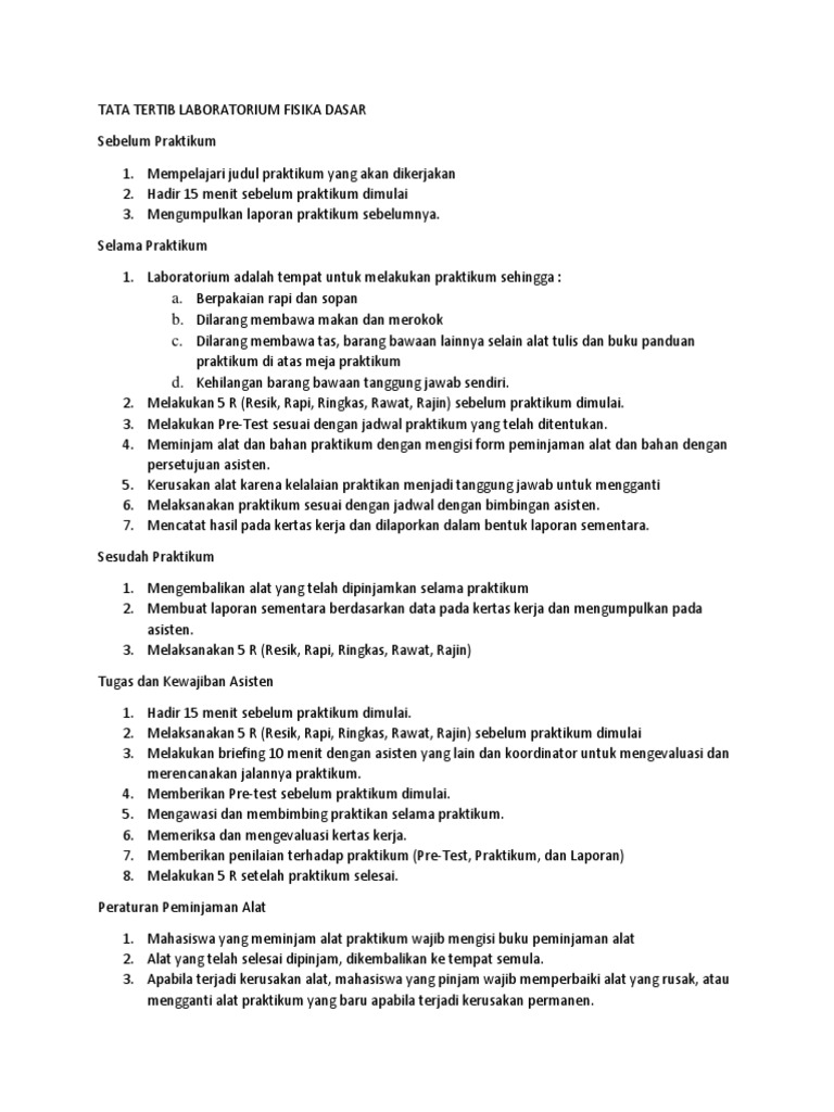 Mahasiswa yang diperkenankan menggunakan laboratorium dan melakukan praktikum adalah mahasiswa yang terdaftar secara akademik praktikan. Tata tertib dan petunjuk umum praktikum fisika dasar Oleh M. Keselamatan kerja dalam laboratorium mencakup cara penyimpanan pemakaian dan perawatan alat atau bahan.