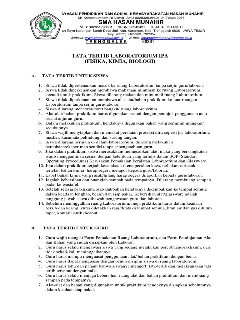 Tata Tertib Laboratorium Ipa Fisika Kimia Biologi Sma Hasan Munahir
