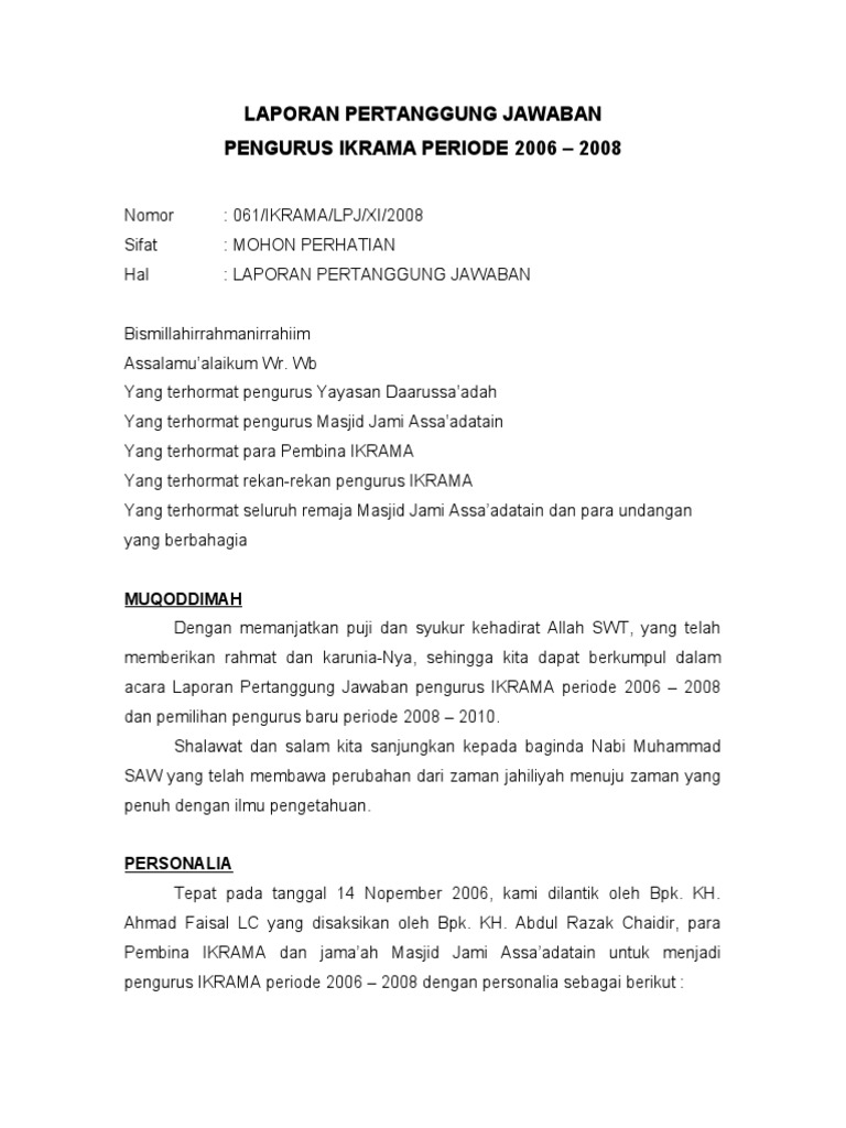 Contoh laporan pertanggungjawaban pengurus masjid. Hasil rapat pengurus dan jamaah masjid ar rahim pada tanggal 08 mei 2016 yang dihadiri para ketua rt tentang penetapan ketua dkm ar rahim periode 2016 2019. Laporan pertanggungjawaban pengurus dkm al muhajirin periode th 2007 2009 kondisi internal dkm al muhajirin. Pada akhir laporan pertanggungjawaban ini ditutup dengan uraian rekomendasi berdasarkan perjalanan pengurus dewan kemakmuran masjid nurul iman masa ibadah 2011 2014.