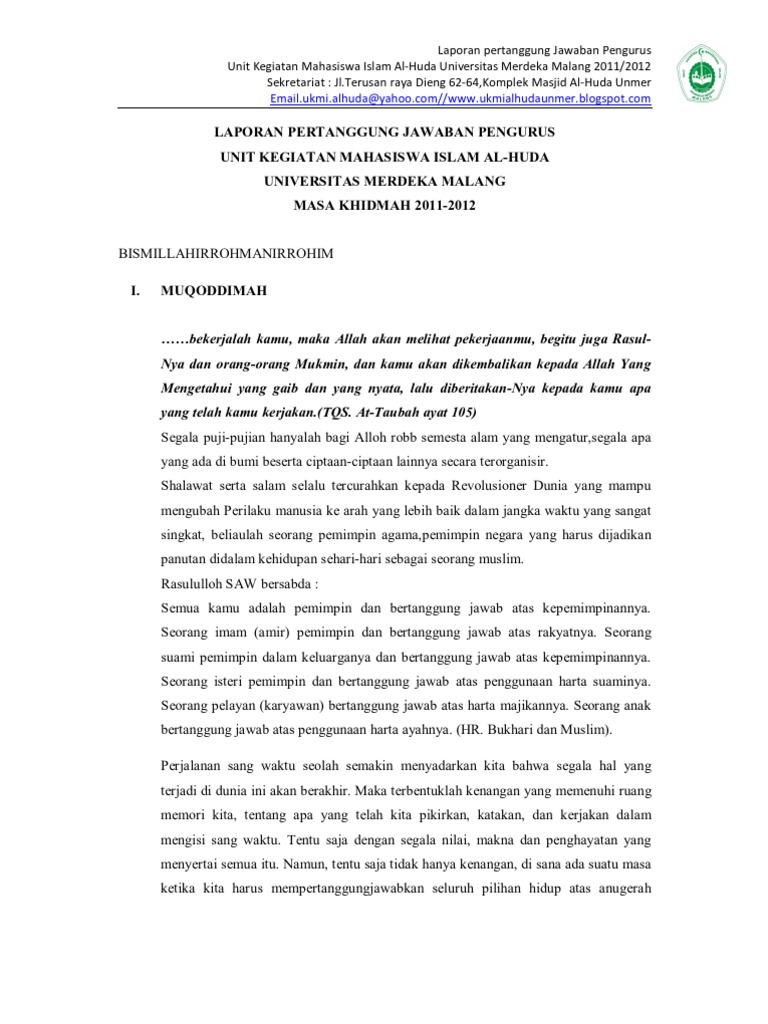 Laporan pertanggungjawaban pengurus dkm al muhajirin periode th 2007 2009 kondisi internal dkm al muhajirin. Sehubungan dengan pemberian dana hibah dari pemerintah kabupaten bantul kepada masjid al musyahadah di dusun xi jogonalan kidul tirtonirmolo kasihan bantul sebanyak rp 5 000 000 lima juta rupiah maka dari itu kami atas nama panitia dan pengurus takmir masjid al musyahadah memberikan laporan pertanggungjawaban tentang dana hibah yang rinciannya terlampir bersama surat ini. Demikian laporan pertanggungjawaban pengurus dkm al hijrah periode 2008 2013.