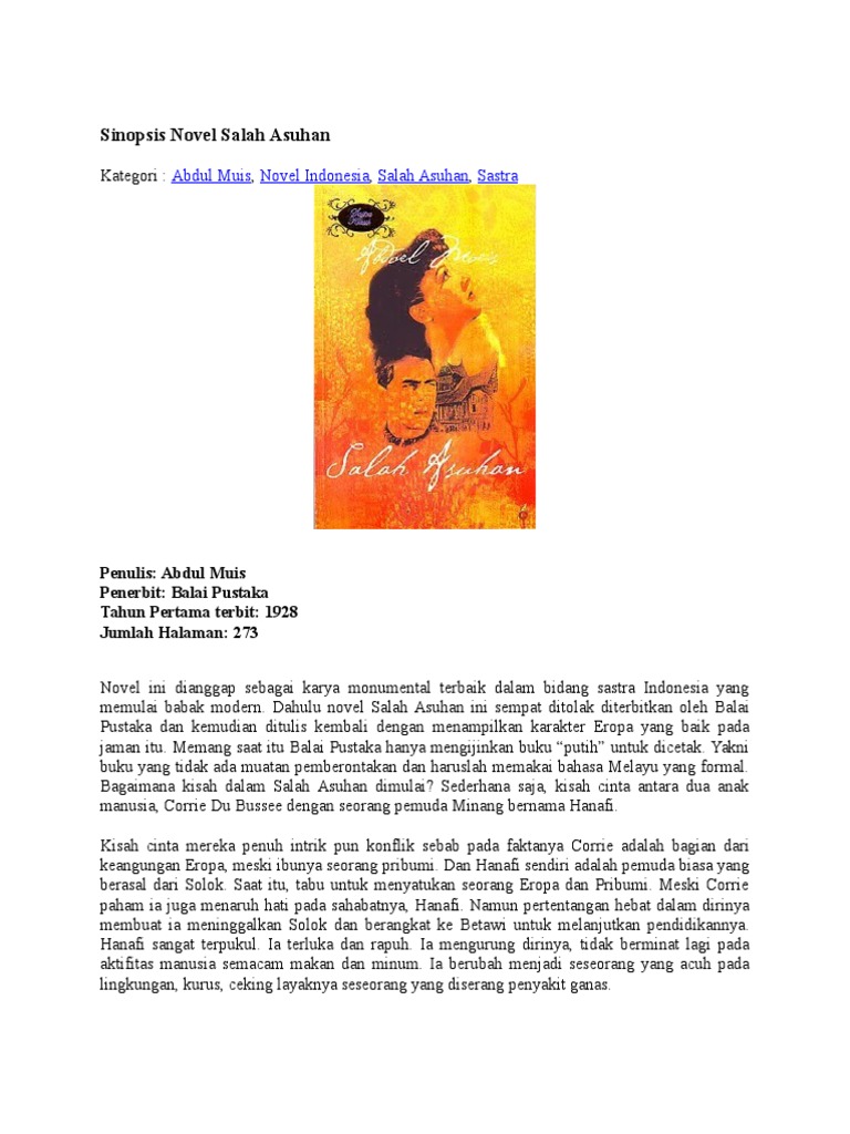 Bagaimana tidak sampai sekarang pun siswa siswi saya sangat senang dengan novel ini. Newer Post Older Post Home. Salah Asuhan adalah sebuah novel Indonesia karya Abdoel Moeis yang diterbitkan tahun 1928 oleh Balai PustakaNovel yang kala itu terbit di Hindia Belanda ini sekarang telah dianggap sebagai salah satu karya sastra Indonesia modern awal terbaik sepanjang masa.