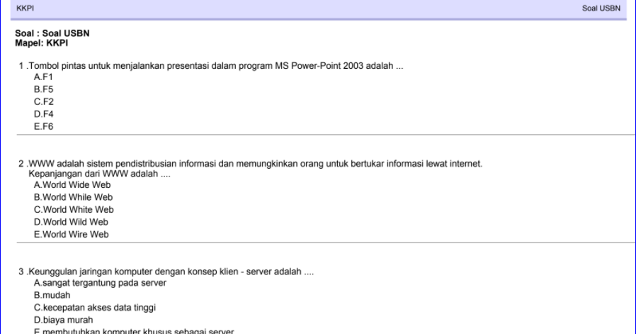 Kumpulan dari lan atau workgroup yang dihubungkan dengan menggunakan alat komunikasi modem atau. UASBN untuk sekolah menengah kejuruan akan memuat 3 tiga mata pelajaran yakni Pendidikan Agama Pendidikan Kewarganegaraan dan KKPI. Soal usbn kkpi smk 2019 dan jawabannya Kisi-kisi dan Kumpulan Soal Tes CPNS 2019 Lengkap dengan Kunci Jawaban Bisa Download Gratis dan Nilai Ambang Batas Resmi November 20 2019 Oleh SMK DIPO.