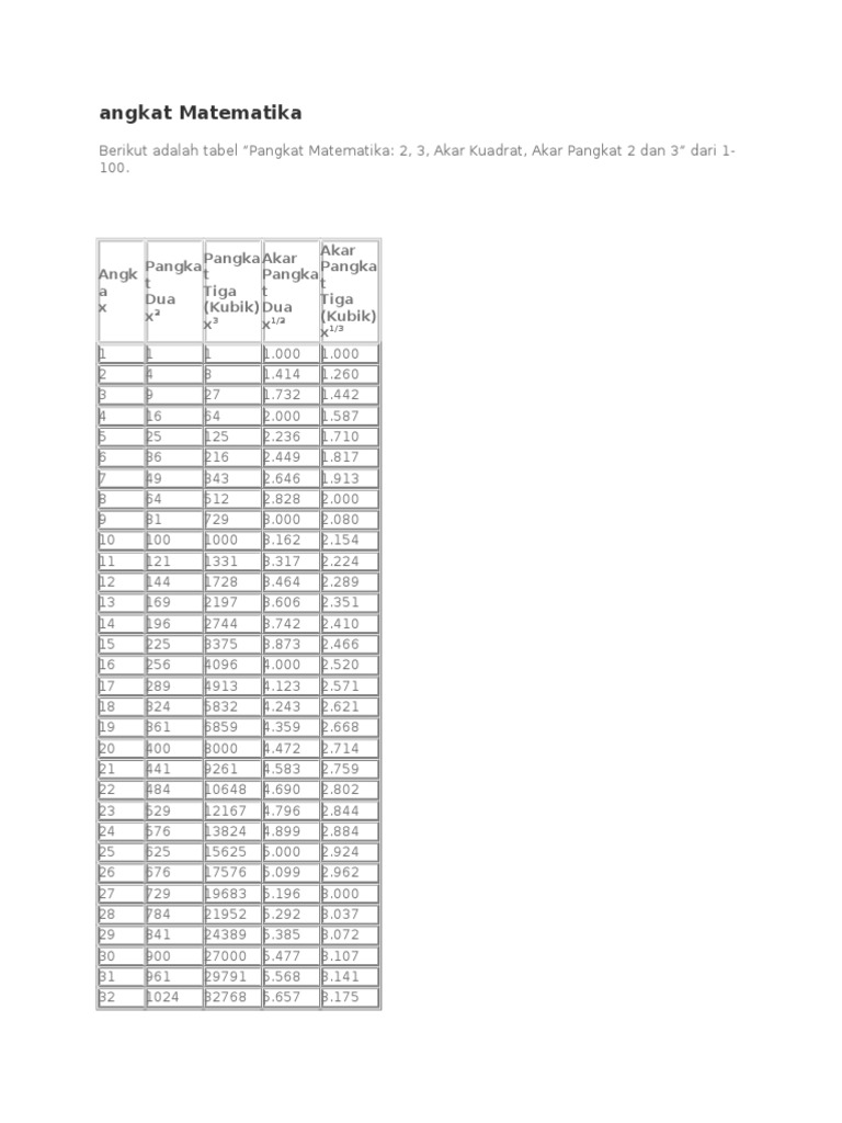 Pangkat Tabel 1 100 Pangkat Dan Akar Pangkat 2 3 Soal Dan Jawaban