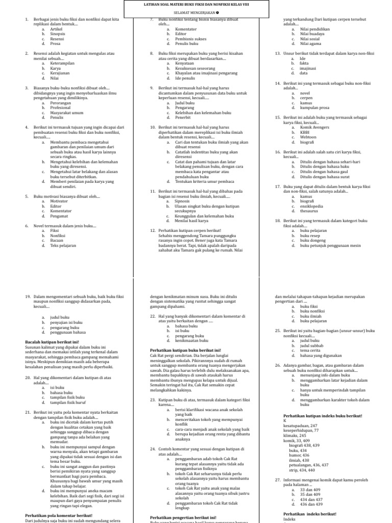 Soal soal fiksi dan nonfiksi kls 7 smp. Istilah fiksi diartikan sebagai suatu karya yang mudah dibuat dan sifatnya tidak terlalu terikat berbagai aturan layaknya karya ilmiah. Latihan Soal Pilihan Ganda Materi Buku Fiksi dan Nonfiksi Beserta Jawaban. Semoga dalam keadaan baik baik saja protokol kesehatan yang disarankan pemerintah merupakan sesuatu hal yang baik untuk kita untuk itu jangan lupa selalu menggunakan masker menjaga jarak dan mencuci tangan yah.